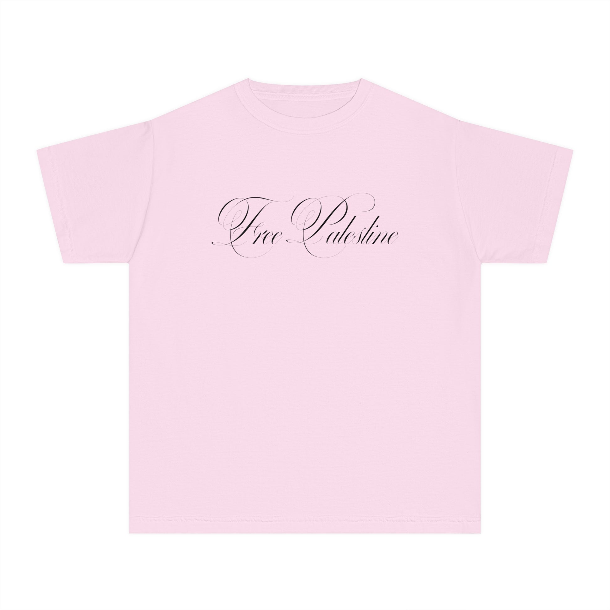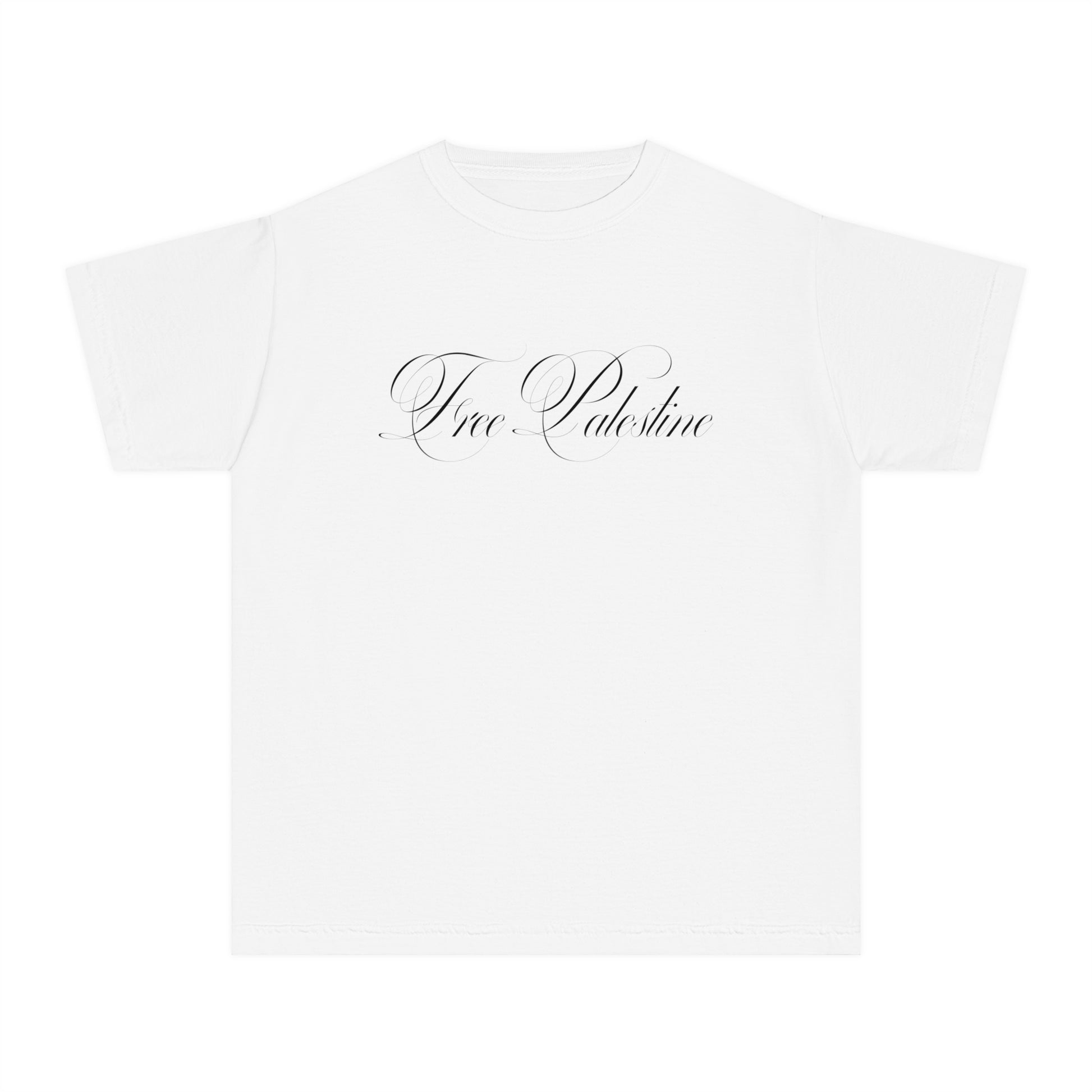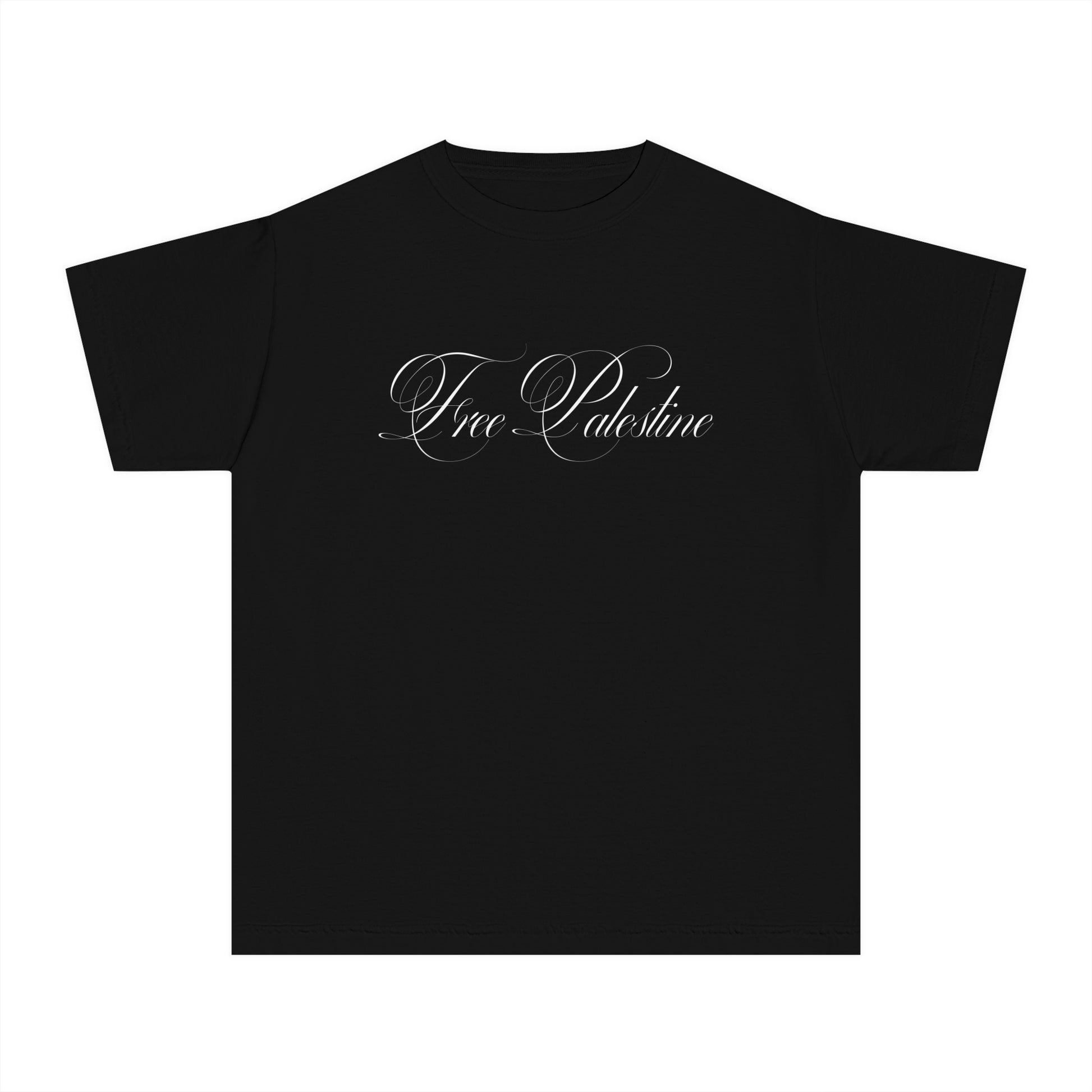 Aesthetic baby tee Free Palestine text. Please note that these are youth sized tees and will fit tightly and have a cropped length on an adult.