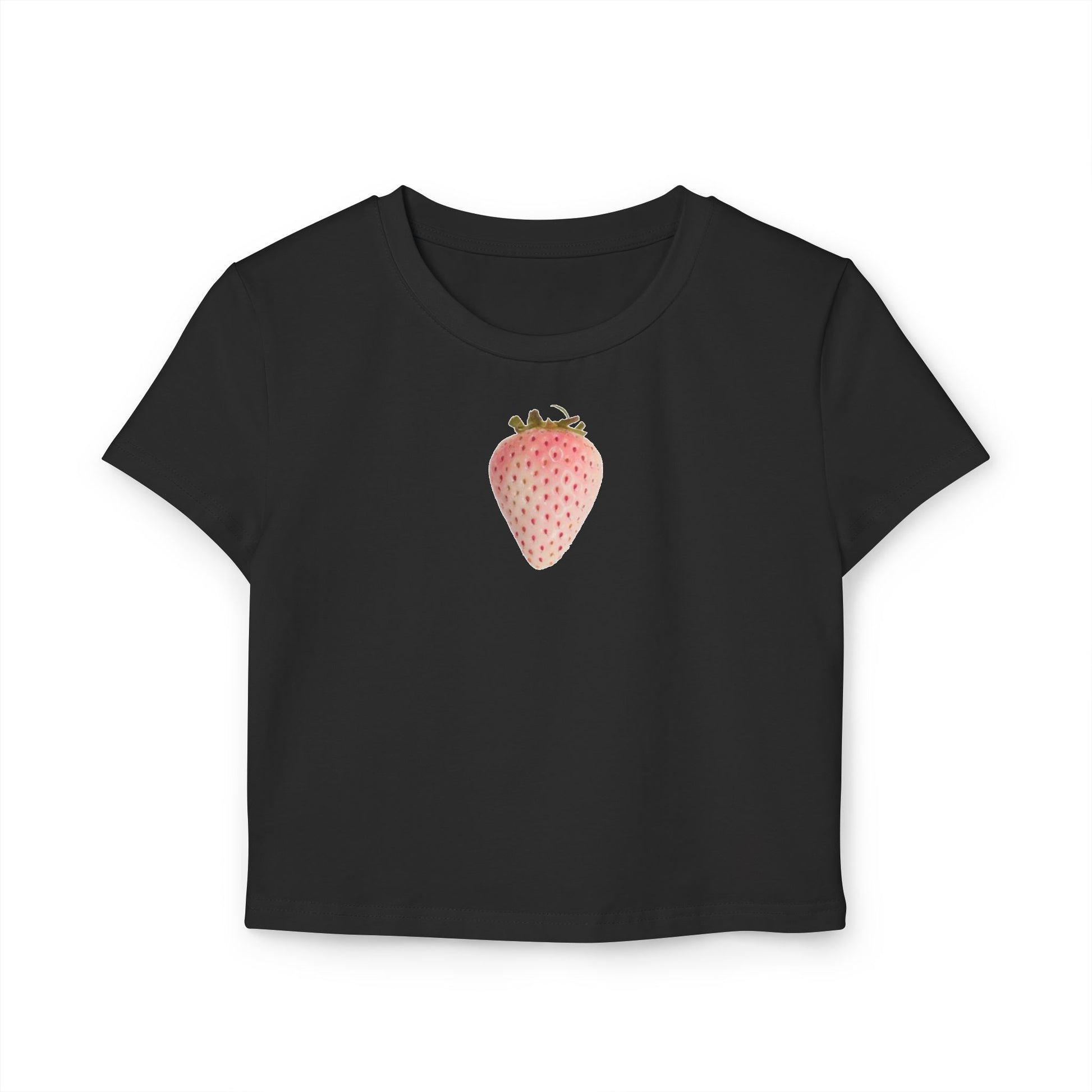 Slim fit baby tee with pink strawberry design.