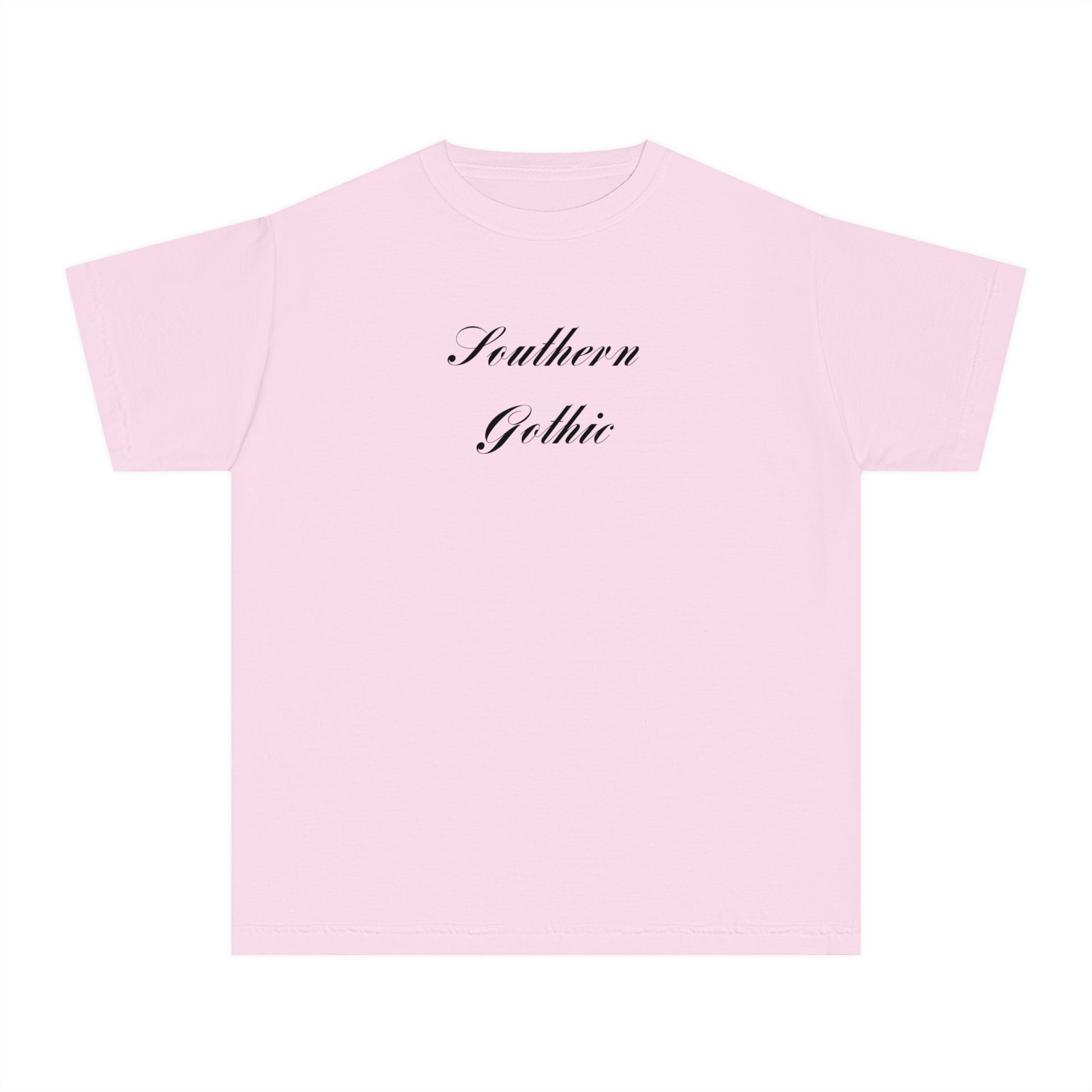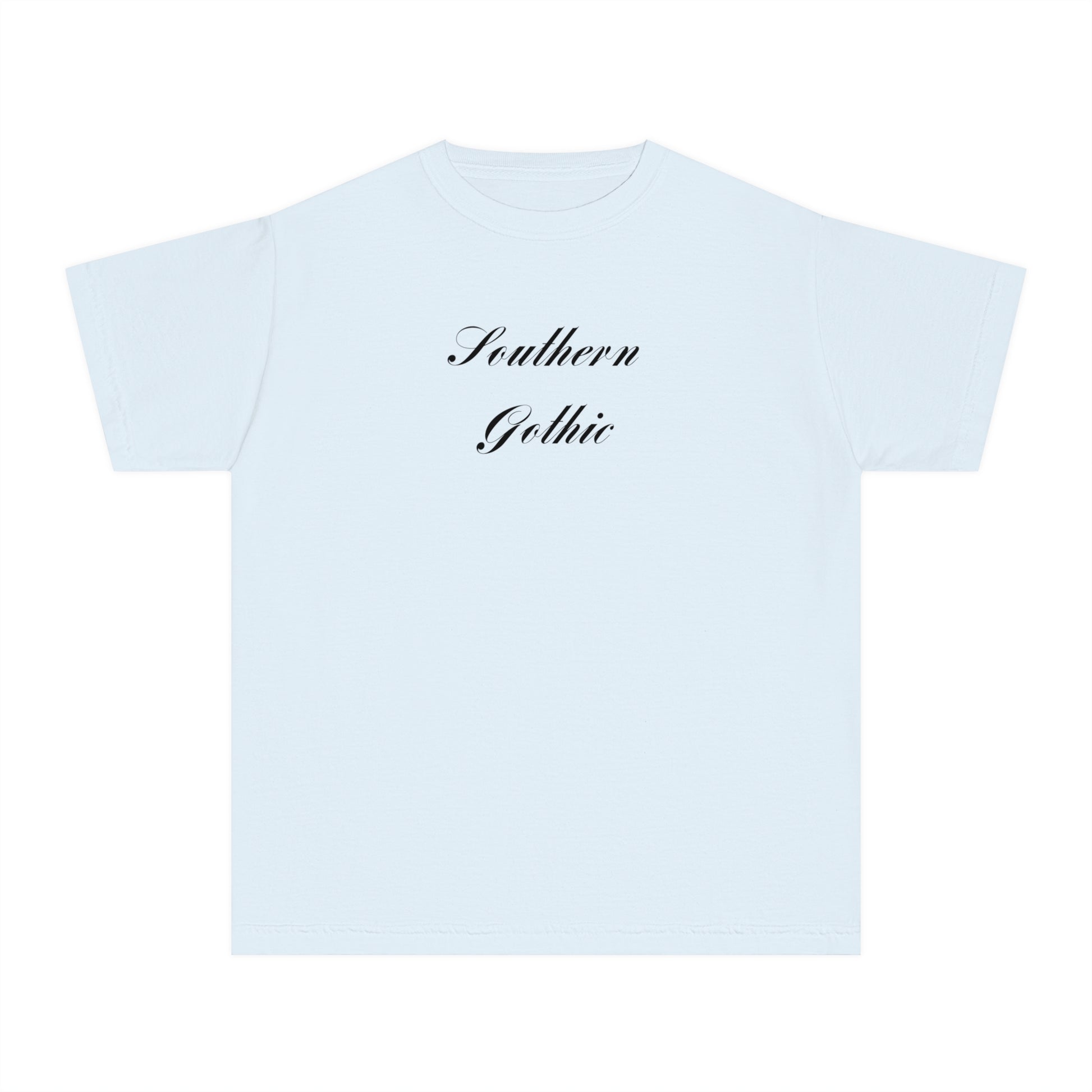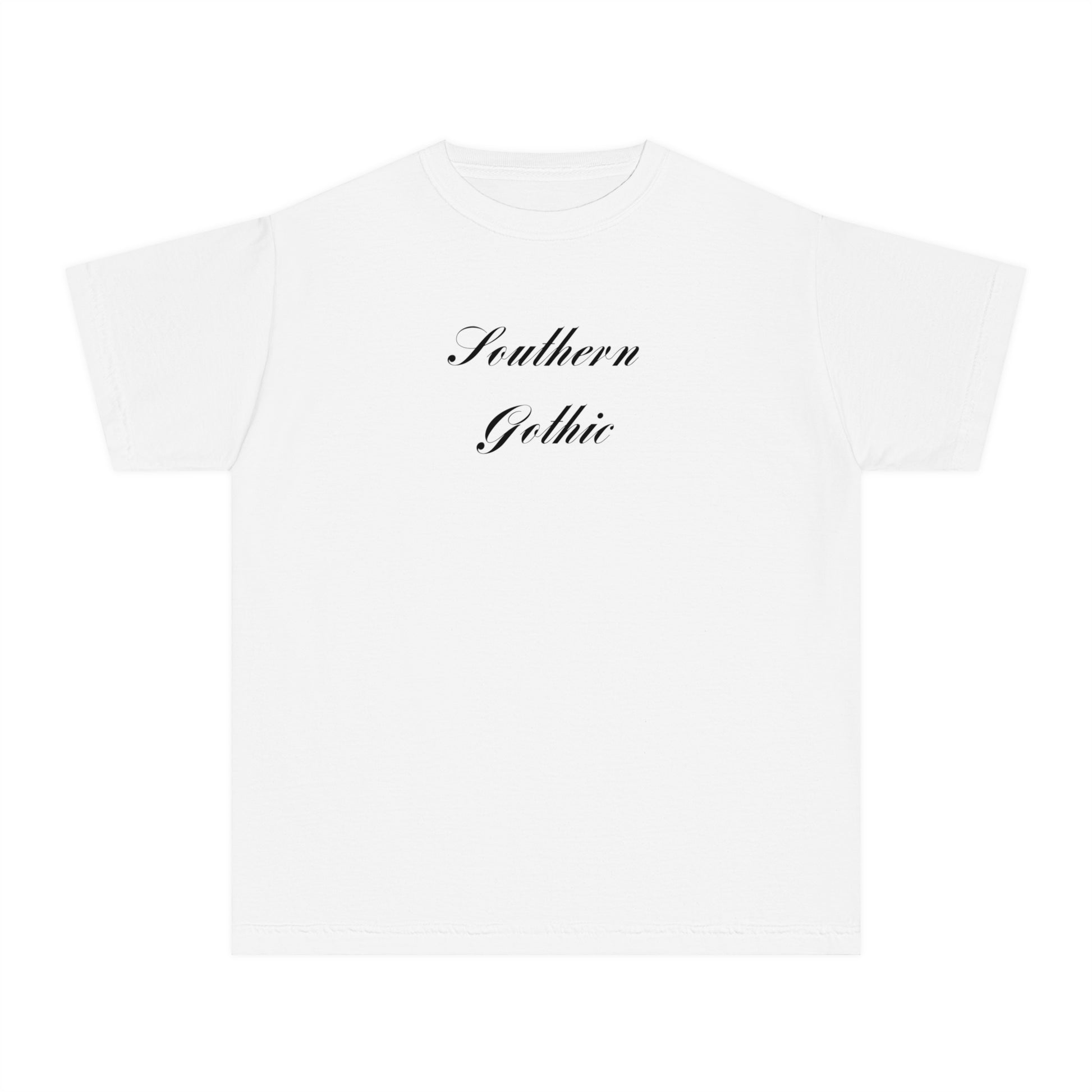 Aesthetic baby tee with Southern Gothic text. Please note that these are youth sized tees and will fit tightly and have a cropped length on an adult.